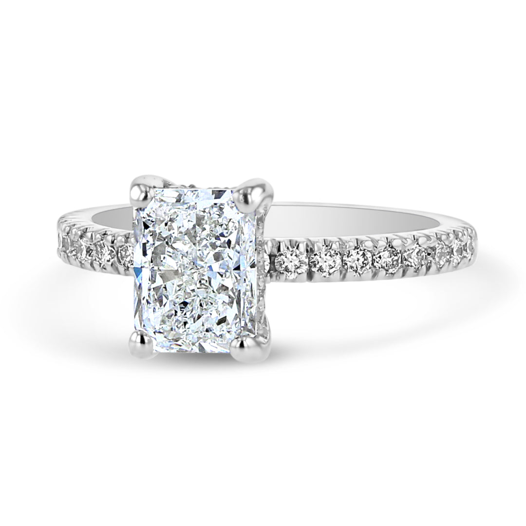 Engagement Ring with Radiant Cut Diamond set in a Four Prongs Basket Style Head with Hidden Halo and Diamonds on The Shank