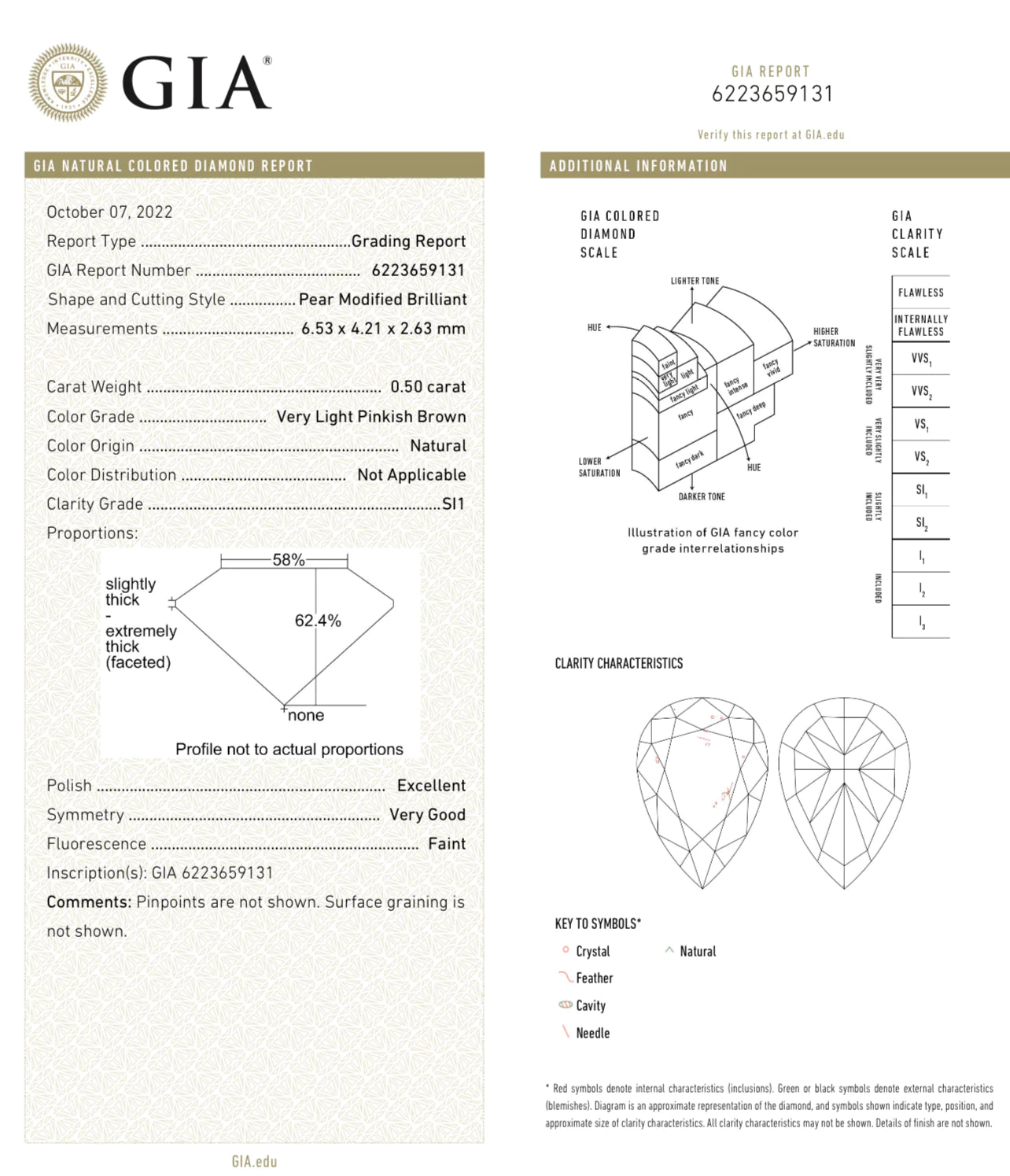 0.50ct center pear shape SI1 clarity GIA certified Very Light Pinkish Brown set with Pink enamel underneath to give it a very pink look Set in 18k white gold Exceptionally sweet color Designed for amazing value
