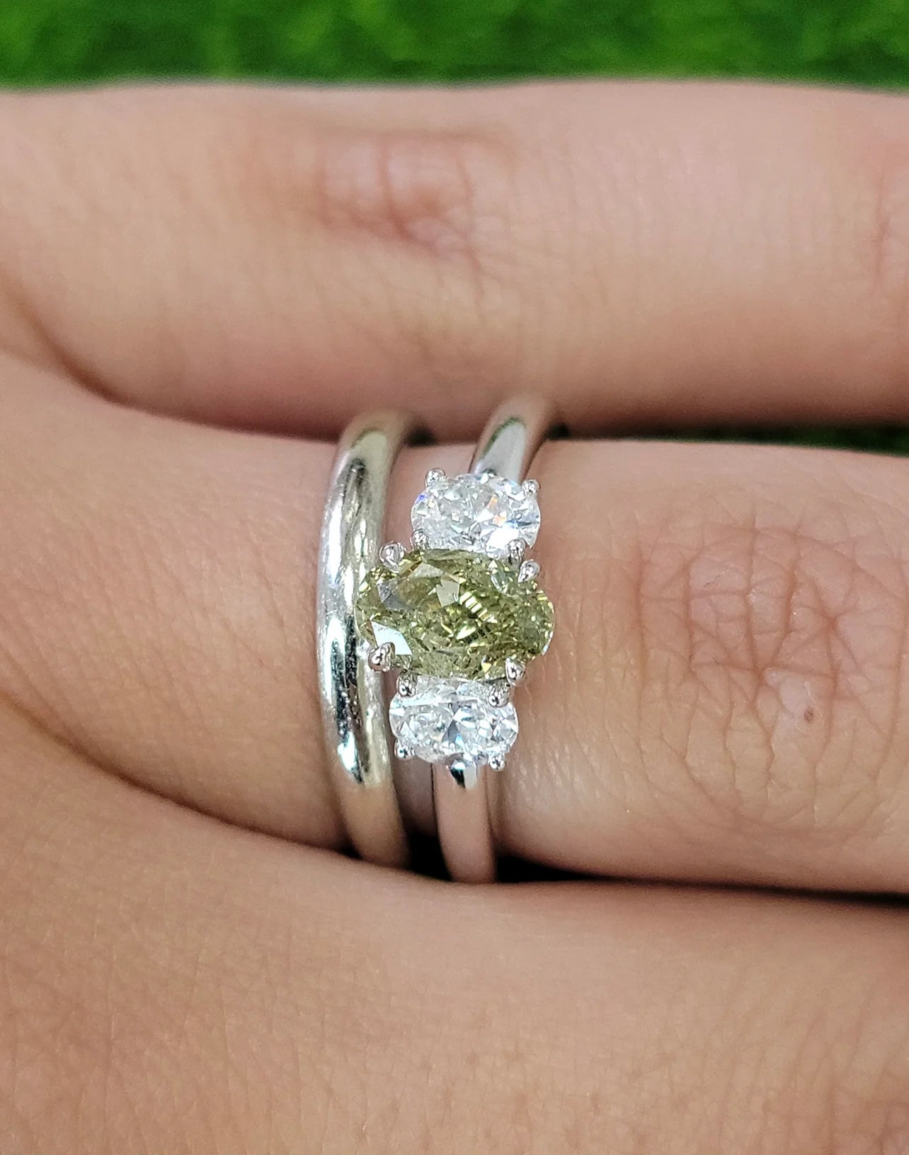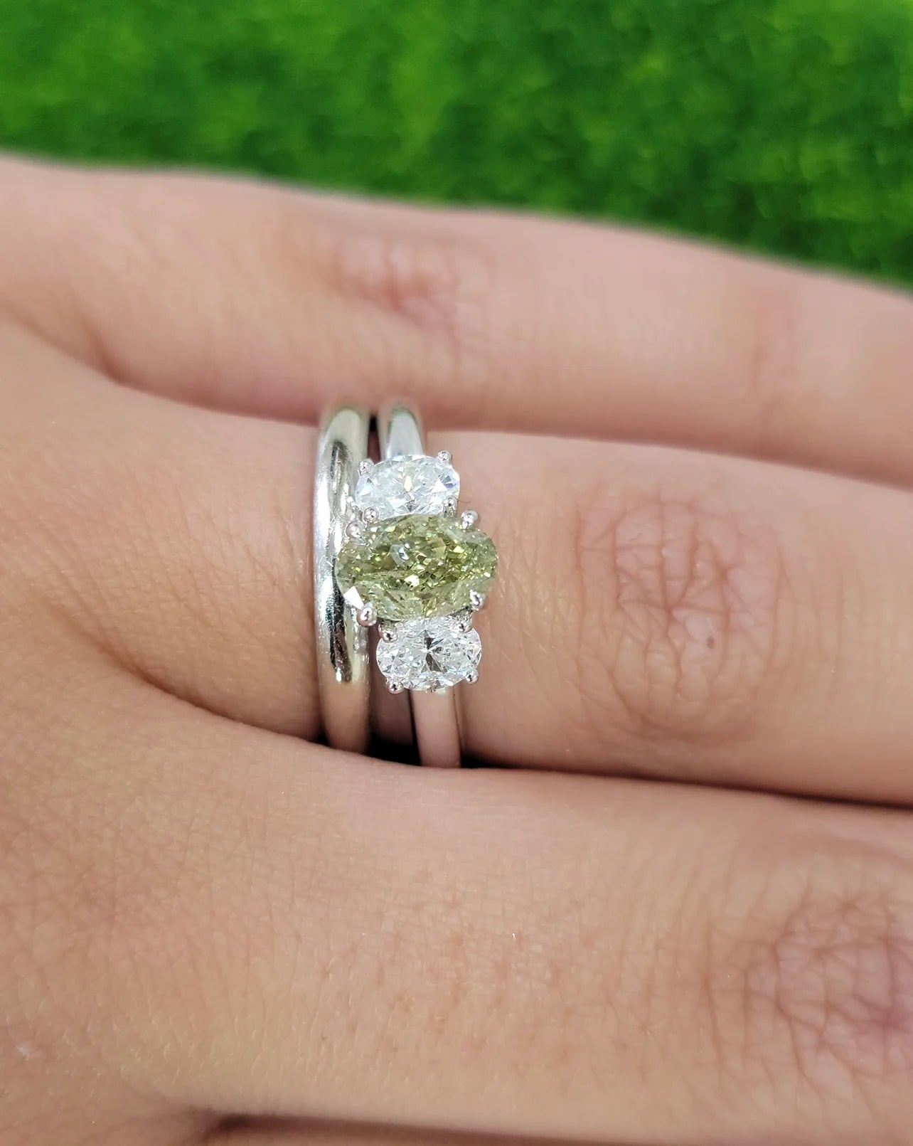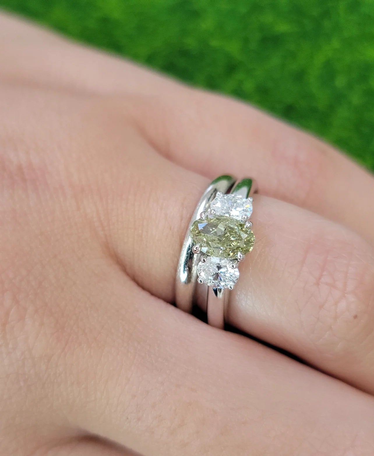 Natural color changing diamond certified as a Fancy Greenish Yellow but facing up predominantly Green. When the stone is left in the dark or heated the door temporarily changes to yellow Set in 18kt White Gold with 0.59ct total weight of white diamond ovals I1 is eye clean, small inclusions spread out