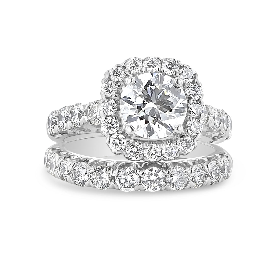 Cushion Halo Engagement Ring with Diamonds on the Shoulders of the Ring. For an extra cost, pair this engagement ring with a fitted wedding band.