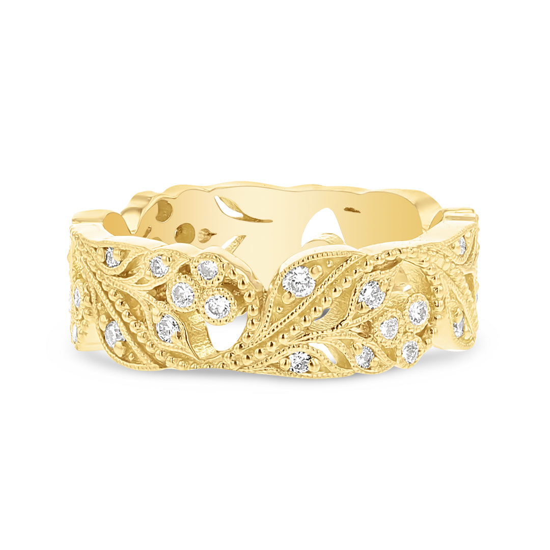 Open-Work Leaf Design Eternity Band With Pave Set Diamonds And Milgrain Details