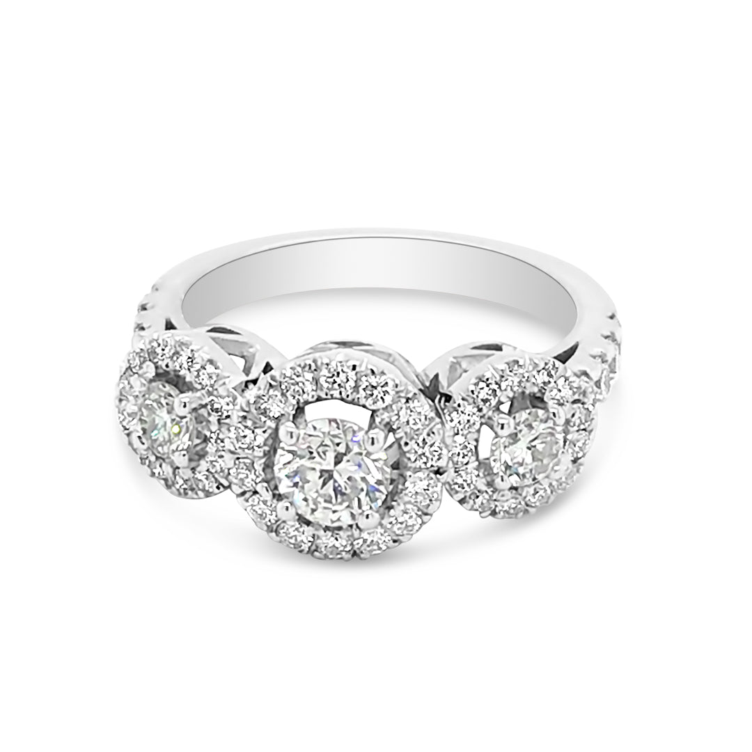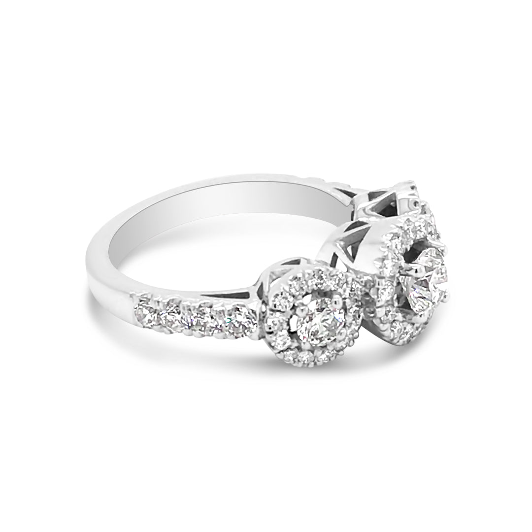 Diamond Three Stone Ring Set on a 14K White Gold Halo Setting with Diamond Shank and Bridge Details