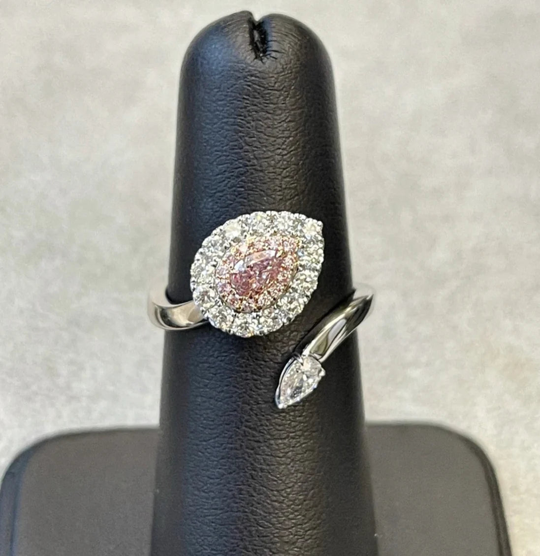 0.23 Carat GIA Fancy Purplish Pink Pear SI1 Clarity GIA Certificate number 5191574980 Set with pink halo and high quality white pear shape and round diamonds. Set in 18k White Gold Total ring weight 1.30 Carats
