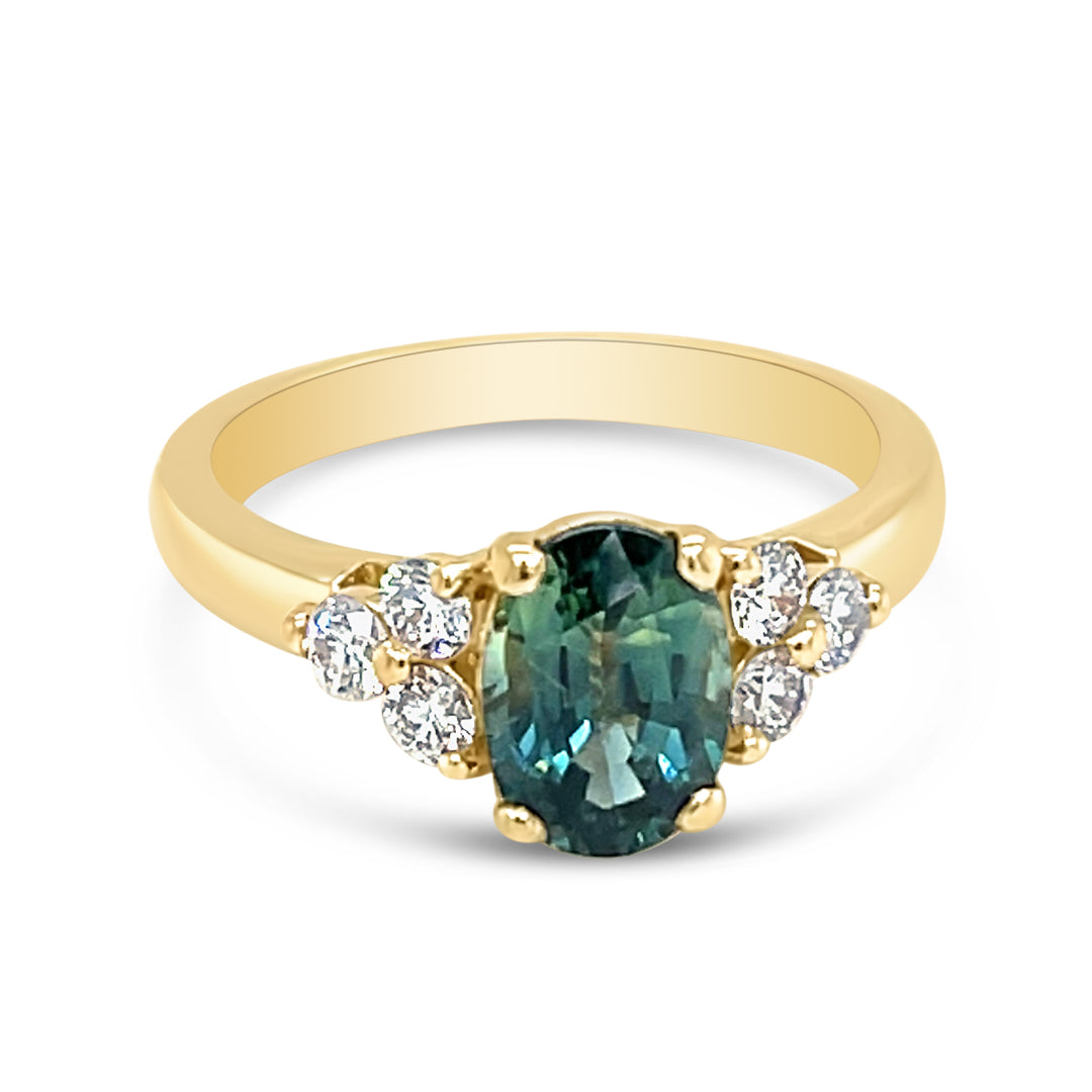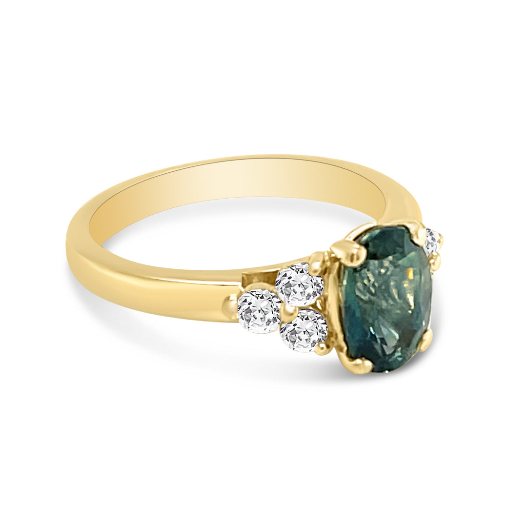 Cluster of Three Round Diamonds Framing Each Side of the Center Green Sapphire Prong Set in Yellow Gold