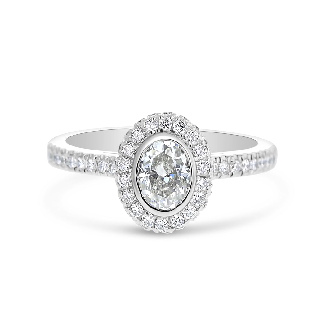 French Pave Diamond Halo Complimented Bezel Set Oval Diamond and Diamonds 3/4 Down the Shank