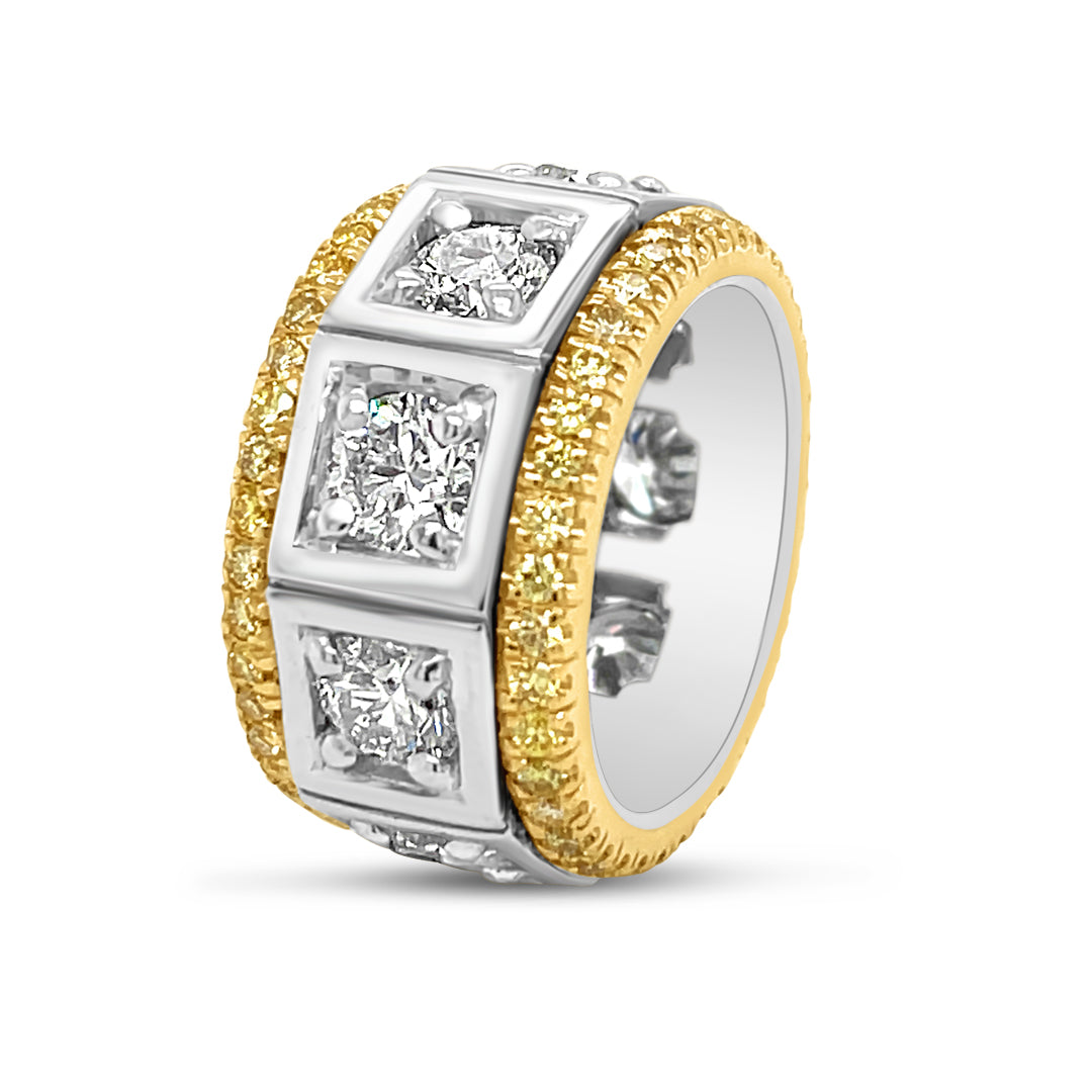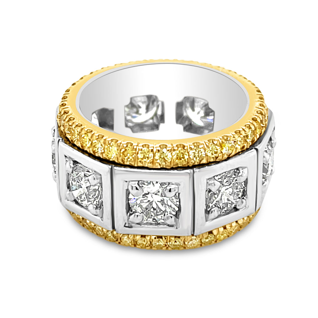 12.5mm Wide Band With Round Brilliant Cut Diamonds Prong Set Inside of Individual Platinum Square Sections Between Yellow Gold Borders with Pave Set Fancy Yellow Diamonds