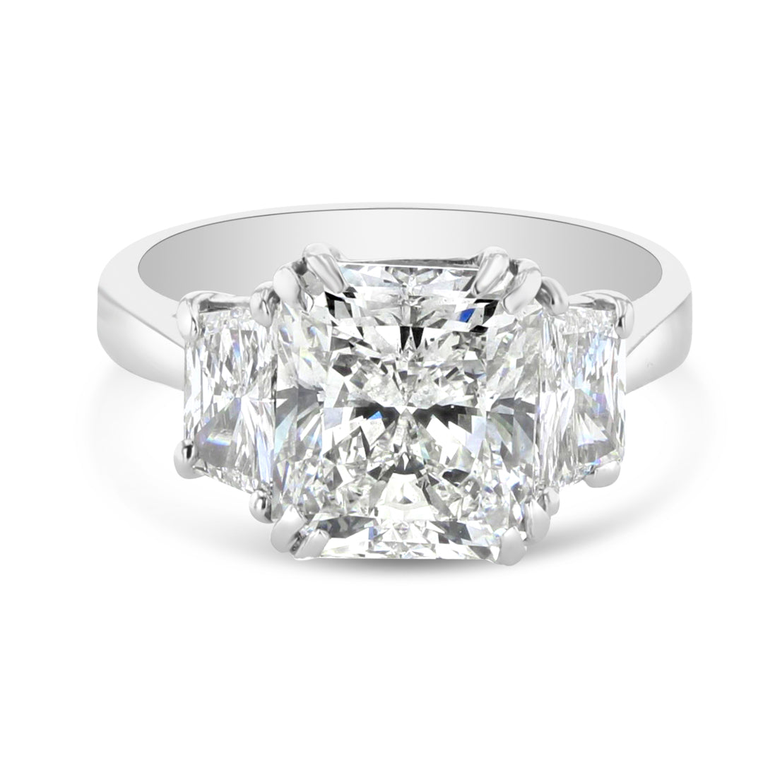 Three Stone Engagement Ring With Radiant Cut Center Diamond and Trapezoids Side Stones