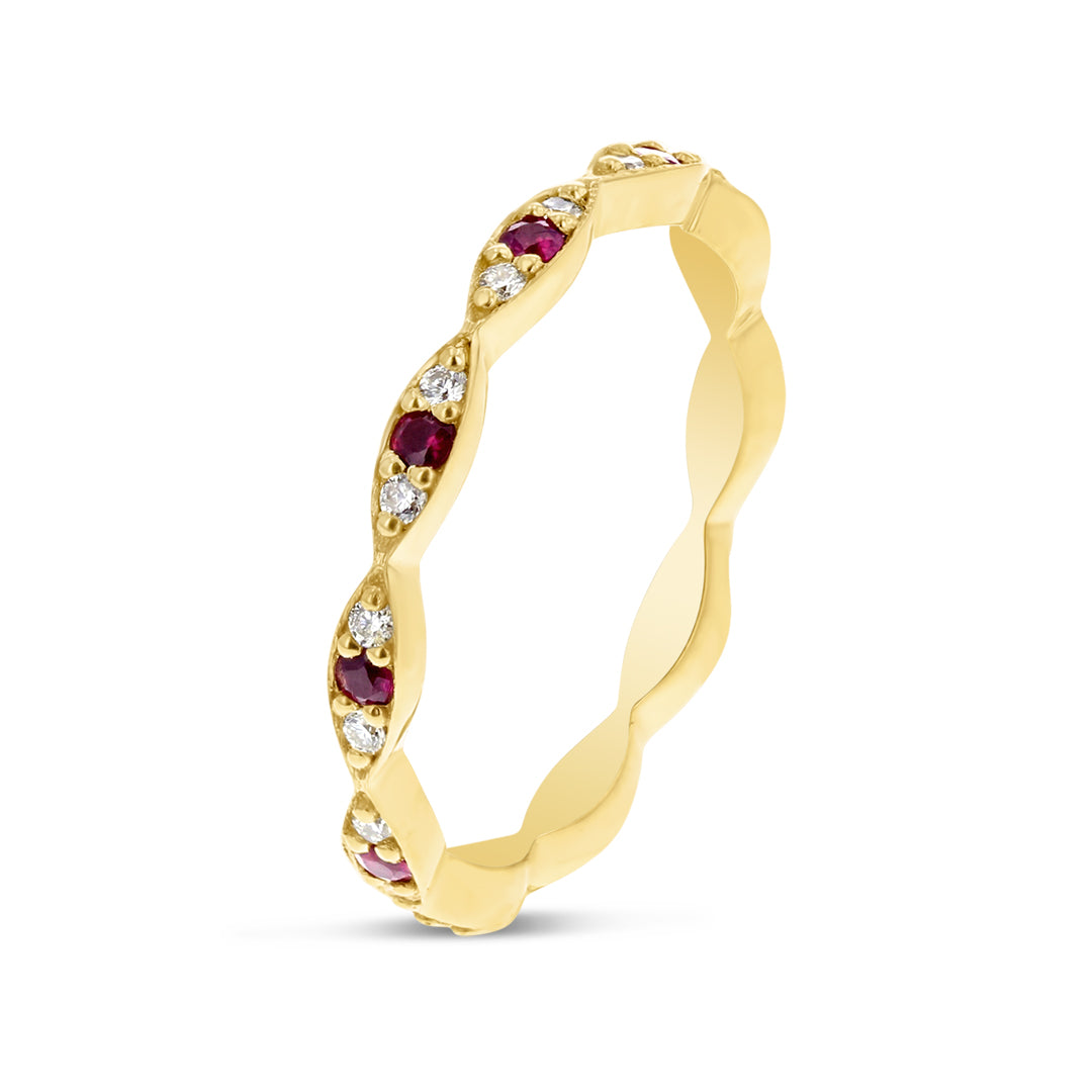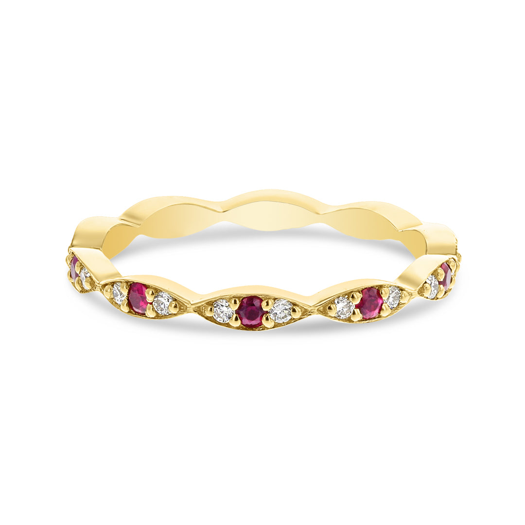 Marquise Shaped Eternity Band in 14k Yellow Gold with Pave Set Diamonds and Ruby