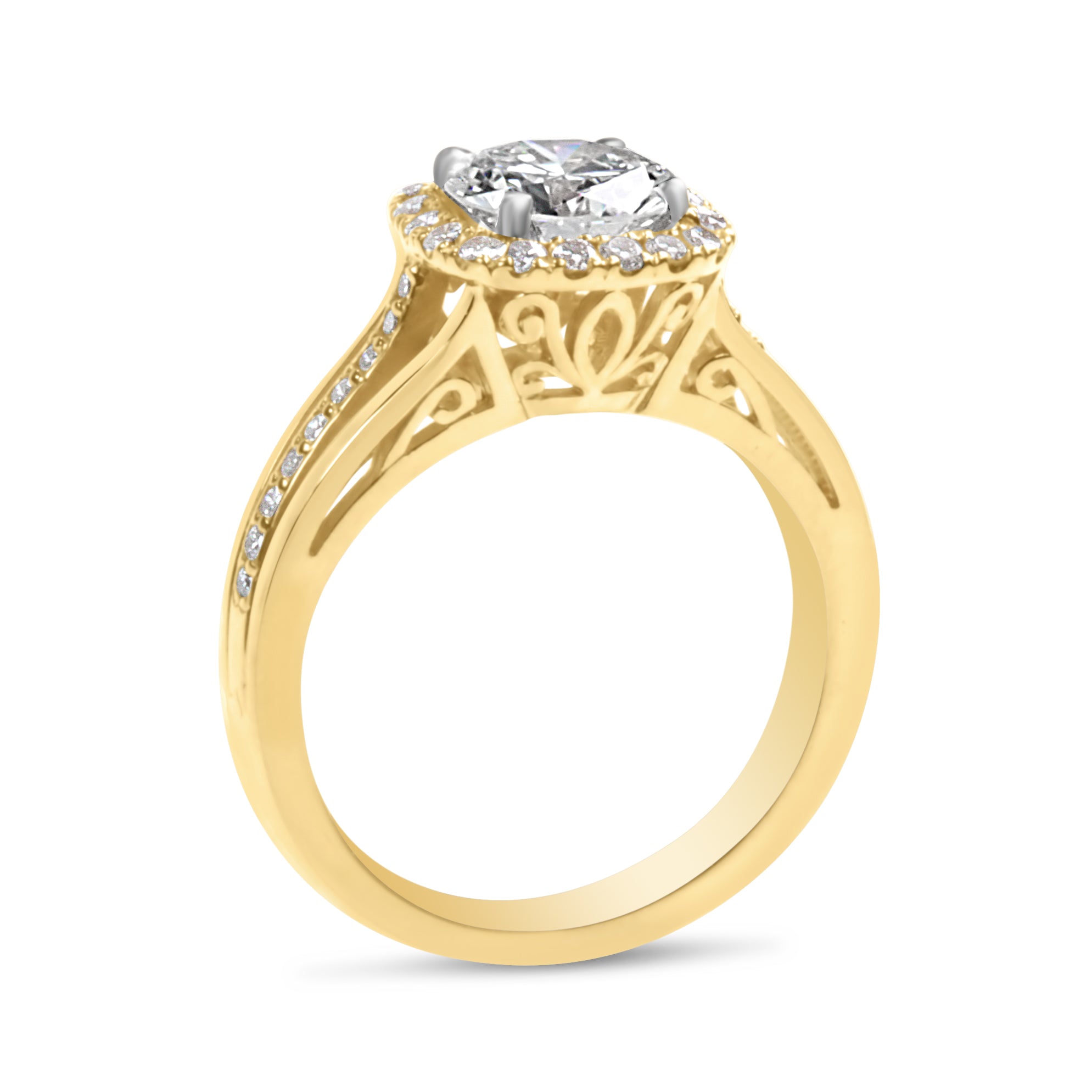 Cushion Shape Halo Engagement Ring with Round Diamond and Pave Set Diamonds on a Split Shank. Filigree Details on the Gallery
